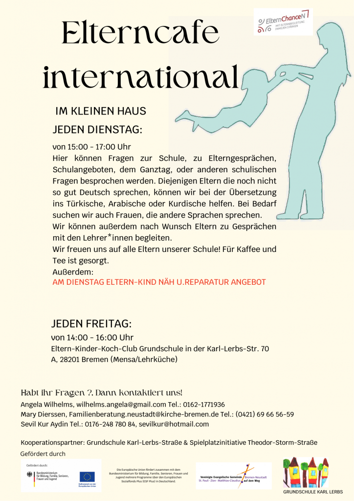 Unser internationales Elterncafé bietet Eltern die Möglichkeit, sich auszutauschen und Unterstützung rund um das Thema Schule zu erhalten. Jeden Dienstag von 15:00 bis 17:00 Uhr im „Kleinen Haus“ können Fragen zu Schulalltag, Elterngesprächen oder Angeboten geklärt werden. Bei Bedarf unterstützen wir auch mit Übersetzungen (z. B. Türkisch, Arabisch, Kurdisch) und begleiten Eltern zu Gesprächen mit Lehrkräften. Für eine entspannte Atmosphäre mit Kaffee und Tee ist gesorgt.