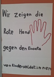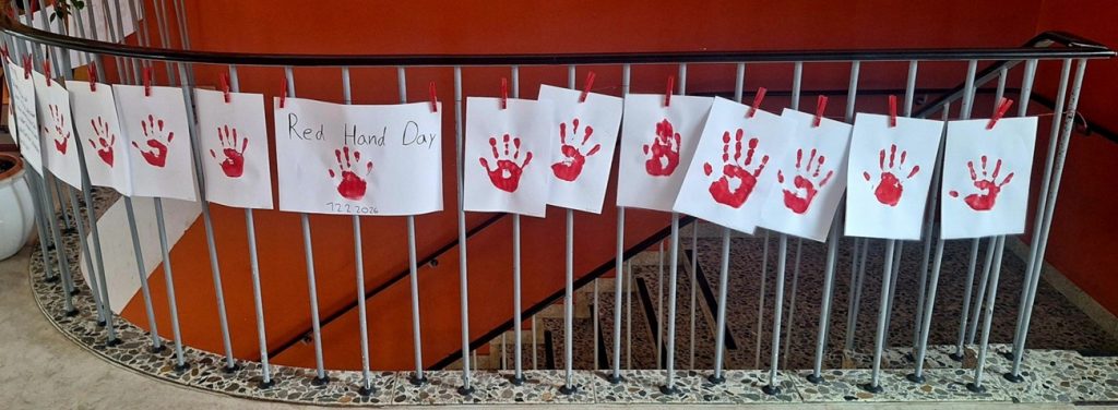 Zum Abschluss des Themenblocks wollten die Wale auf eine besondere Kinderrechtsverletzung hinweisen. Am 12.2. finden weltweit Aktionen gegen den Einsatz von Kindersoldaten und -soldatinnen statt. Der Tag heißt „Red Hand Day“ und alle Menschen sind aufgefordert ihre „Rote Hand“ zu zeigen, um gegen dieses Unrecht zu protestieren. Die Wale haben das durch ihre roten Handabdrücke im Flur von Haus 2 gezeigt und damit auch andere auf das besondere Datum und den notwendigen Protest hingewiesen.