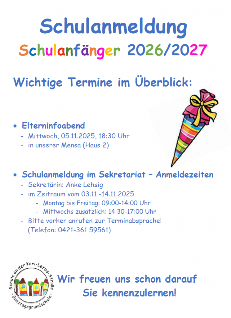 Liebe Eltern! Wir laden Sie ganz herzlich zum ersten Kennenlernen unserer Ganztagsgrundschule an der Karl-Lerbs-Straße ein! Die erwarteten Anmeldezahlen sind sehr hoch. Damit wir Sie am Mittwoch, den 01.11.2023 in der Mensa (Haus 2) alle herzlich empfangen können, möchten wir zwei Termine anbieten: Sollte Ihnen die eine Zeit besser passen als die andere, kommen Sie…