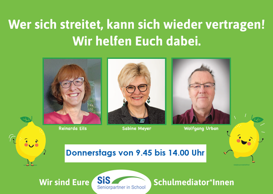 Die SiS sind jeden Donnerstags von 9.45 bis 14.00 Uhr für unsere Kinder da. Unsere SiS sind: Frau Eils, Frau Meyer und Herr Urban. Sie sind in dieser Zeit im Raum der guten Lösungen zu finden.